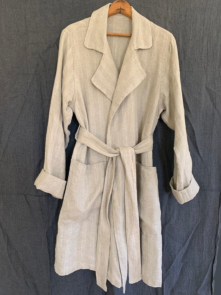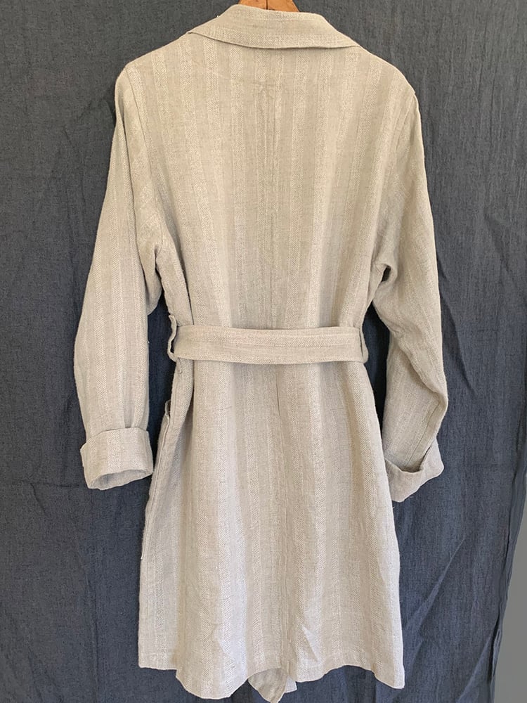 This wide-collared trench coat is made of soft vintage linen that has a stripe in the weave for a subtle texture. It is soft and perfect to throw over any summer frock that might need a wrap. This one is awaiting your size for the button placement. It can be double or single-breasted, loose or more cinched. This fabric is one-of-a-kind and the sample is available. Order other colors or fabrics via email.
